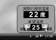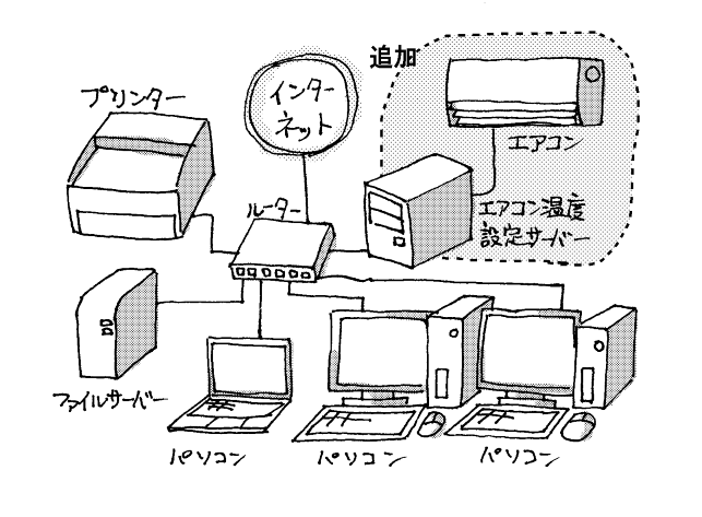 おそらく、気の利いたオフィスであれば、図1のような感じでパソコン同士のネットワークが組まれ、プリンターやファイルサーバーを共有できるようになっているだろう。インターネットへの接続は、オフィスによっては制限されているかもしれない。このネットワークに、エアコン温度設定サーバーを追加し、各パソコンにはエアコン温度設定用の小さなプログラムをインストールする。このソフトは図2のような感じのものになるはずだ。各パソコンの前に座った人は、そのソフトで、現在の設定温度と自分が希望する設定温度を見れる。そして、暑いなーと思ったら、自分のソフトの設定温度を下げる。あるいは寒いと思ったら上げる。エアコン温度設定サーバーは、各パソコンからの希望温度を集計し、その多数決をとるか平均を計算するかし、エアコンに伝える。同時に各パソコンに現在の設定温度としてフィードバックする。このとき、多数決にするか平均にするかは、サーバーの設定によって変えられるようになっているが、標準状態では次の理由により平均のほうが適しているだろう。
