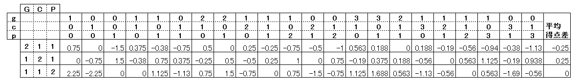 図5 自分が4手順の繰り返し戦略をとったとき、相手の戦略による、ひと勝負あたりの平均得点差