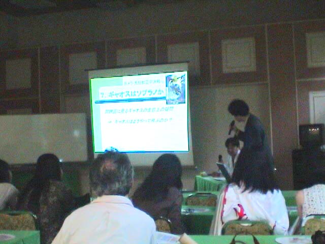 二日目午後3時からの1時間半という大会終盤に行われた発表会でしたが、多くの参加者に聞いて貰うことができました。ありがとうございました。音響やプロジェクタ等の準備が完全でなかったため聞きずらい場面もあったようで、申し訳ありませんでした。発表した内容の一部は2003年前期論文集に収録されています。